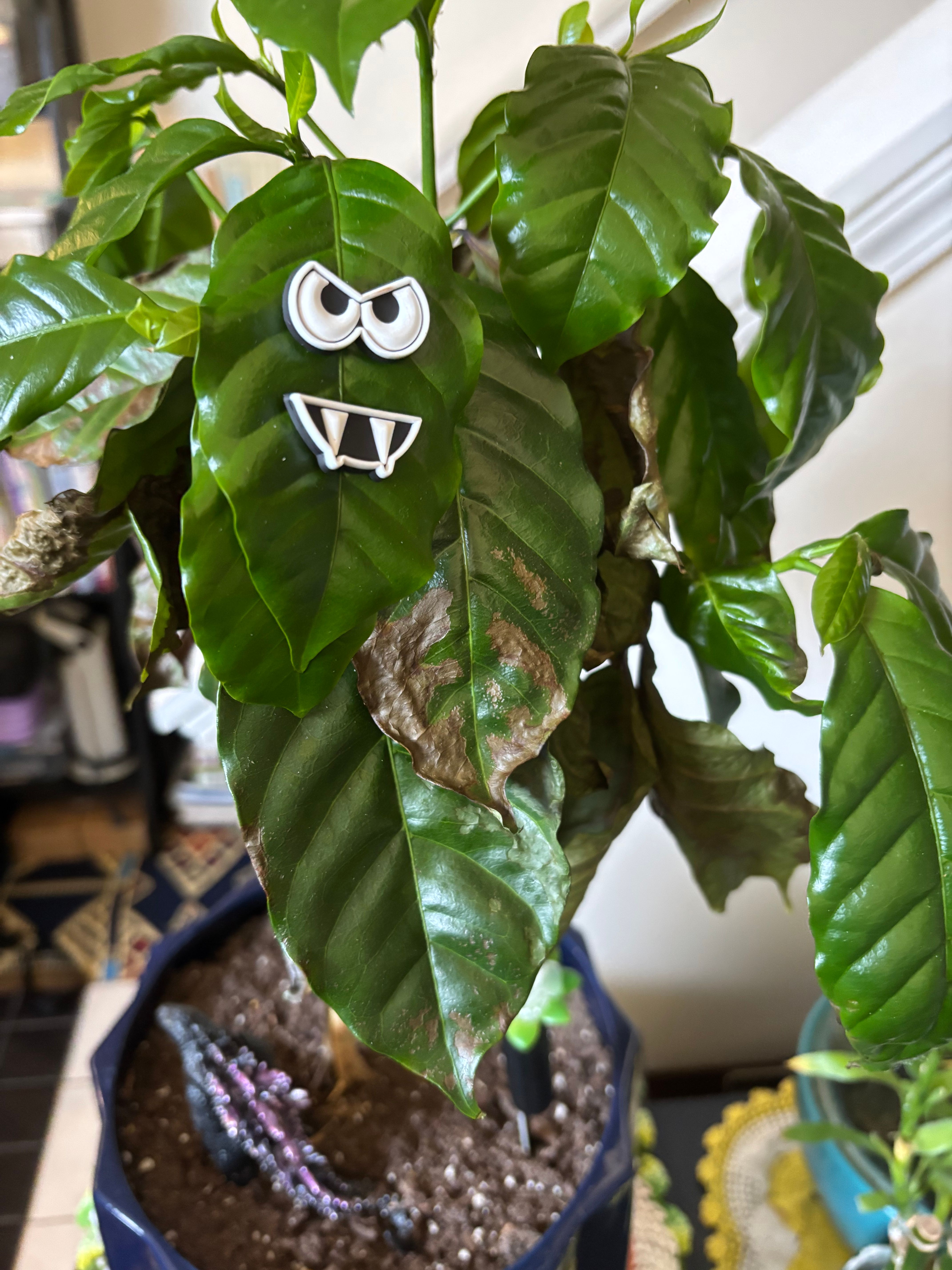 Meet Mephistopheles, mighty guardian of the Devil’s Brew, a.k.a. our future Arabica coffee beans. In three or four years… We may be blessed with beans… Yes, this will be a long-term commitment.